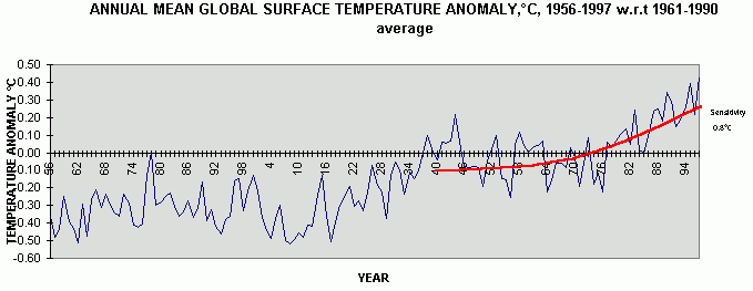 Figure 1 - Annual global temperature anomalies 1859-1997, w.r.t. the 1961-1990 average, showing the "Best Fit" Climate Sensitivity of 0.8°C for a computer climate model to the data since 1940.