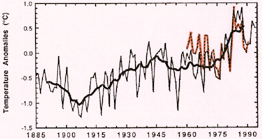 Figure 2. Jones (1994) South African temperature anomalies 1885-1993, with 10-year smoothed values. The orange over black dashed line indicates 1960-1990 temperature anomalies of the 19 non-urban sites.