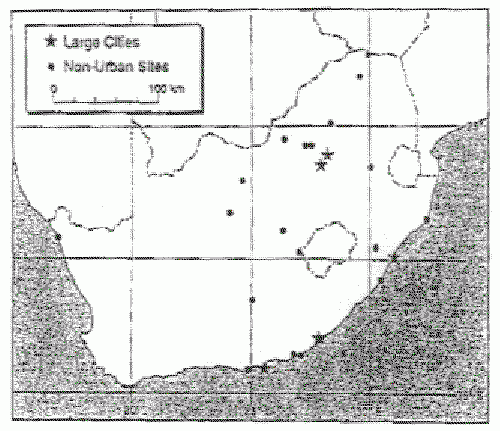 Figure 1. Map of South Africa showing Jones grid cells, five large cities, and 19 non-urban stations